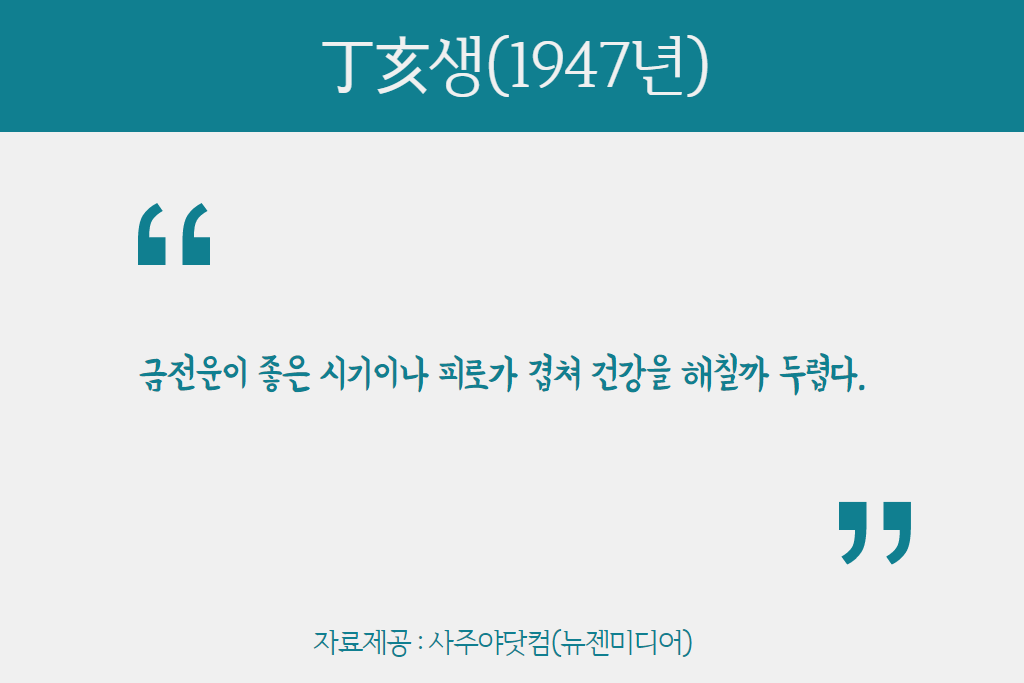 금전운이 좋은 시기이나 피로가 겹쳐 건강을 해칠까 두렵다.