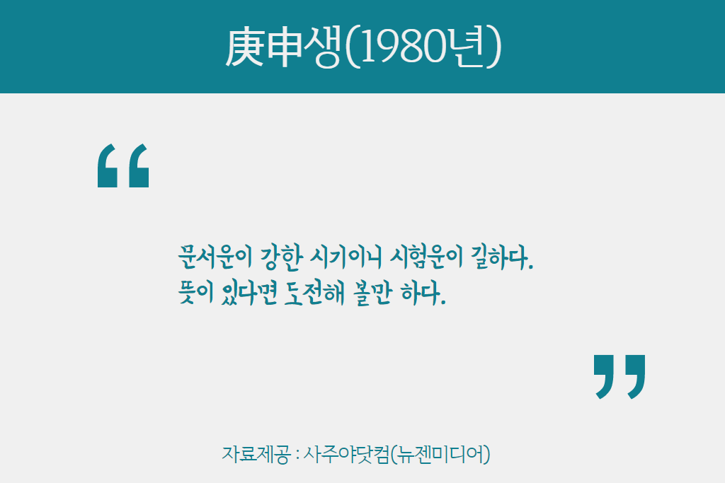 문서운이 강한 시기이니 시험운이 길하다. 뜻이 있다면 도전해 볼만 하다.